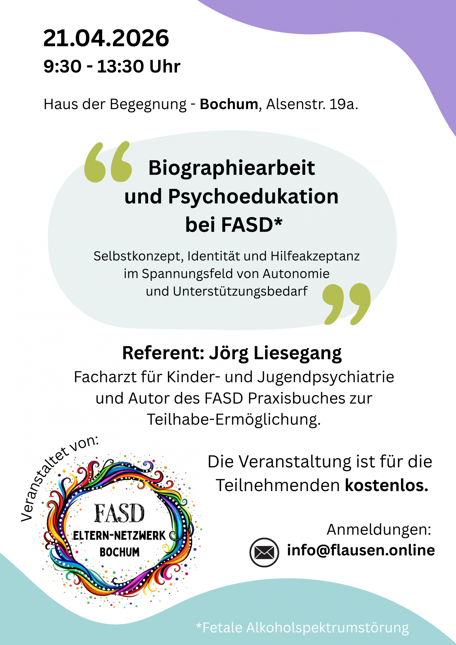 Veranstaltungstipp: „Biographiearbeit und Psychoedukation bei FASD“ am 21.04 von 9:30-13:30 Uhr mit Facharzt Jörg Liesegang aus Berlin. Weitere Infos findet ihr hier!